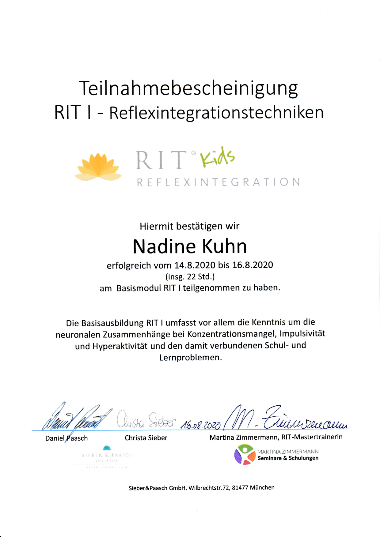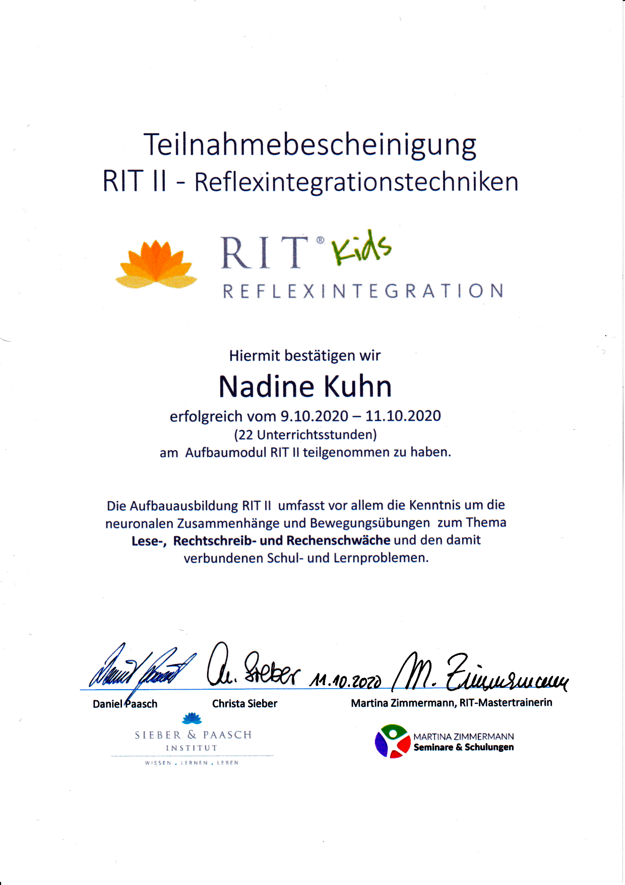 Nach meinem Studium absolvierte ich die Ausbildung zur Reflexintegrationstrainerin um Kindern mit Lese-, Rechtschreib- und Rechenschwäche, Unkonzentriertheit, Hyperaktivität, fehlender Impulskontrolle, schlechter Körperkoordination, Ungeschicklichkeit sowie